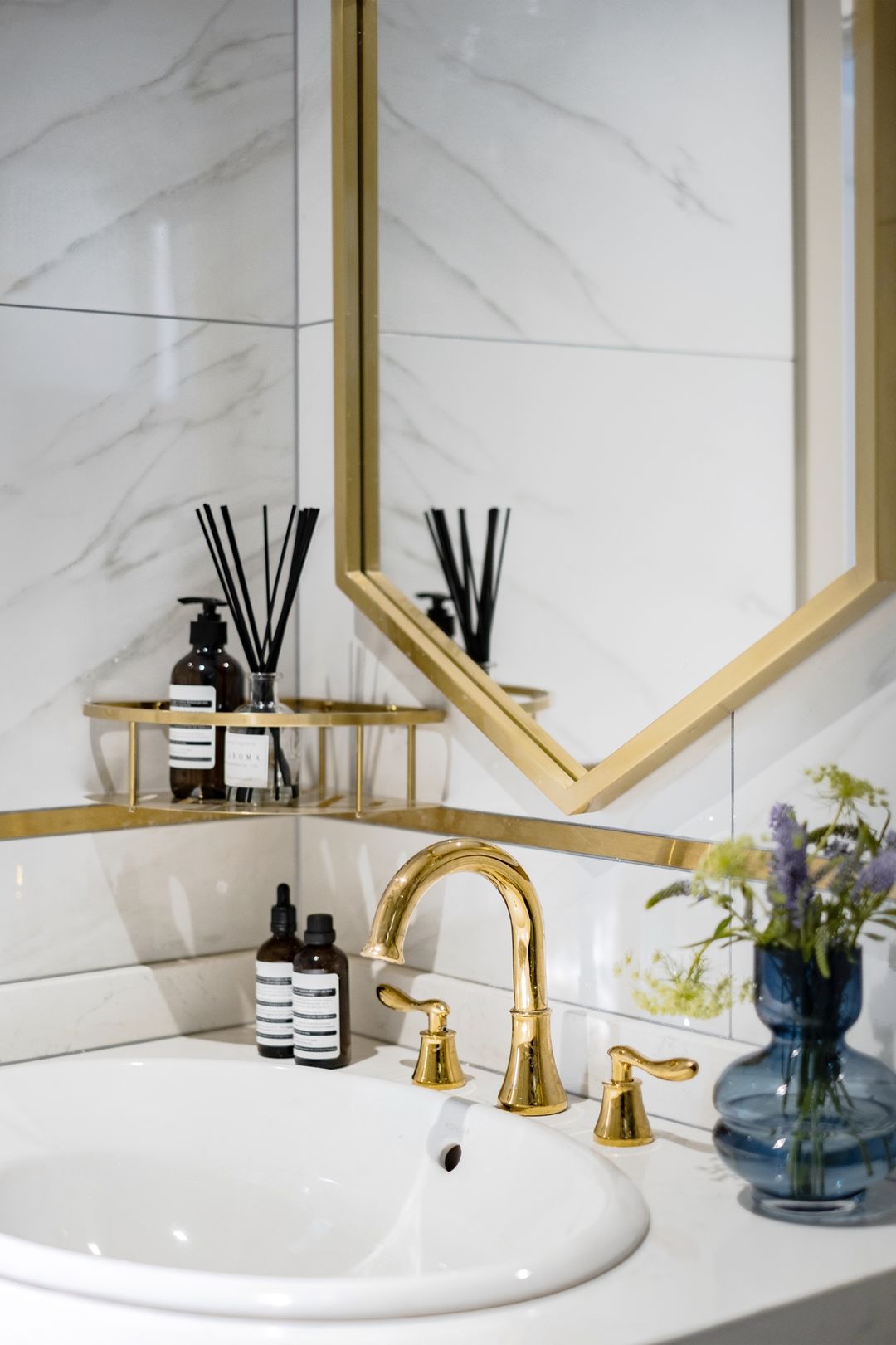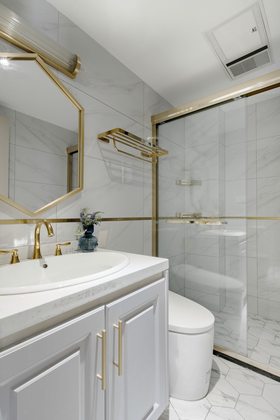 卫生间同样采用了黄铜材质,让卫生间同样具有仪式感。地面瓷砖使用了大理石元素,白色与金色构成的卫生间。看起来整洁干净,也能看出女主人的优雅和注重品质。