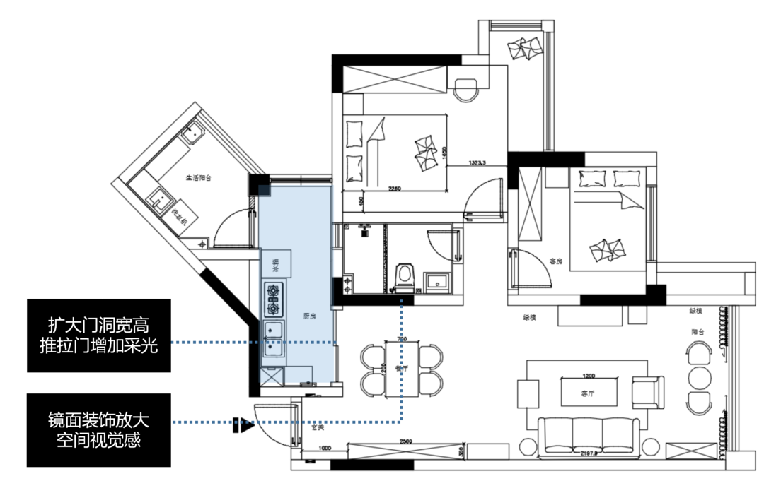 通过扩大门洞,让厨房的采光能通向客厅餐厅。