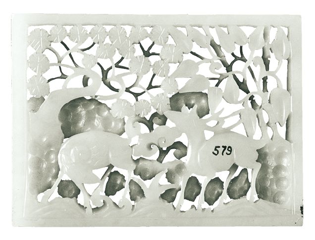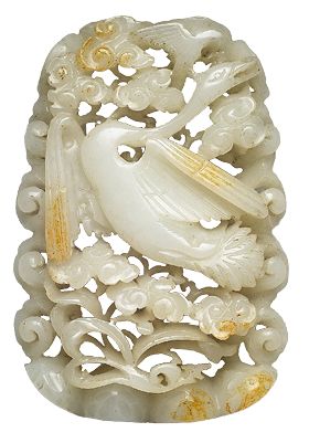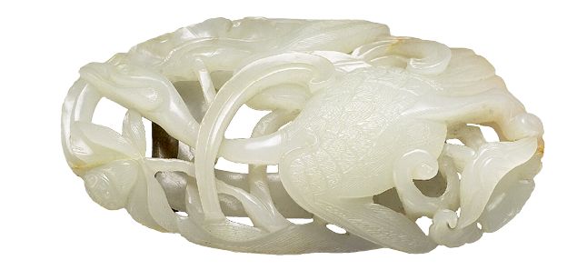 这枚小巧的金元时期秋山玉(台北故宫博物院)便是典型的俏色“秋山玉”。从其大小而言,应该是一枚男子的帽饰。与前面提到的金代“春水玉”一样,尽管镂空,它的雕工相对古朴笨拙。同一时期的“秋山玉”还可以在长沙博物馆收藏的一枚玉带板里可以看到。广东博物馆也收藏了一枚元代的“秋山玉”玉带板。由此可见,相对于“春水玉”,中国广大农耕社会能够对“秋山玉”的主题引起强烈的共鸣,从而令“秋山玉”很快地融入主流社会并加以发挥,这一点从元代“秋山玉”带板里人物的出现可以看出。的确,尽管朝代的变迁,“秋水玉”的主题基本上一脉相承,没有发生大的变化。湖北明代梁庄王出土的一块玉饰便是一块精美的“秋山玉”。当然,并不是所有的“秋山玉”皆为俏色雕琢。“秋山玉”里也有用白玉雕琢而成,如这块白色秋山玉,它表现的风格与俏色玉迥然不同。