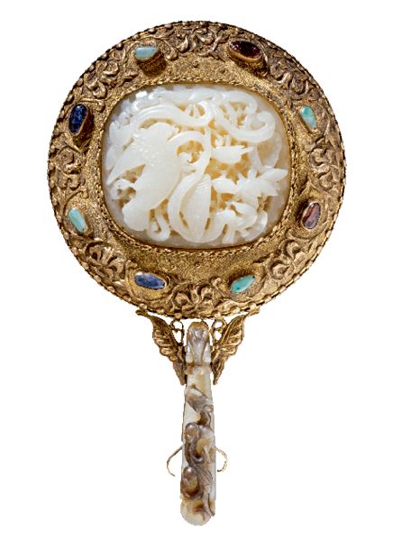 随着时间的推移,“鹘擒鹅”为题材的玉佩逐渐成熟起来,磨合出一定的格式。作为腰带的有机部分,它们大多为长方形或椭圆形,中间依旧为“鹘擒鹅”的画面,四周则环绕着一圈水珠纹或水窝纹,从而赢得了“春水纹”玉佩的名头。如这一款水珠纹春水玉和水窝纹春水玉。当中的大鹅、雁笨拙扭曲,惊慌失措,占据了大部分的画面,而海东青娇小翩翩,尽管往往处在不起眼的一隅,依然展现出其翱翔勇猛的身躯。同样的风格也体现在这块元代的“春水玉”饰上。从形制上判断,它最初是一块玉带板;但在被LACMA收藏之际,它已被旧物利用成为元代一枚镜子背面的玉饰。有趣的是这面镜子的手柄也是旧物循环,它由当时一枚流行的“苍龙教子”的带头镶嵌而成。蒙古人在中亚打通了中西方商贸通道,海外彩色宝石得以大量流入中国,为广大的中国人所认识,不再囿于上流社会,这面宝镜便是活生生的物证。