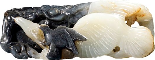我们现在看到的早期“春水玉”多出自金代的玉佩。上海博物馆收藏了一枚春水玉绦环,便是金代“鹘攫鹅坠”的典型玉佩。早期的“鹘攫鹅”在这枚绦环上表现得淋漓尽致:白色的肥鹅在黑水之上垂死挣扎,而黑色猛禽海东青则从后面攫住了它的命脉,令其不得动弹。金代的玉雕工艺相对古朴笨拙,但这件作品充分利用俏色来表现动感和张力,令“鹘擒鹅”的画面栩栩如生。
