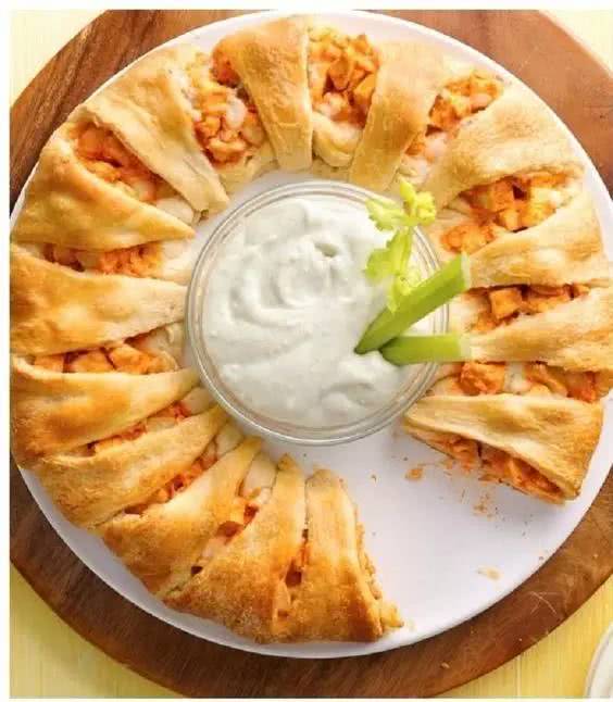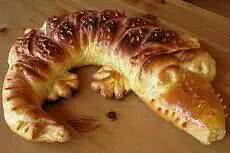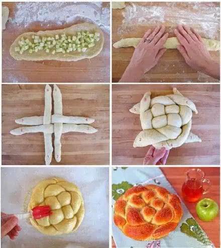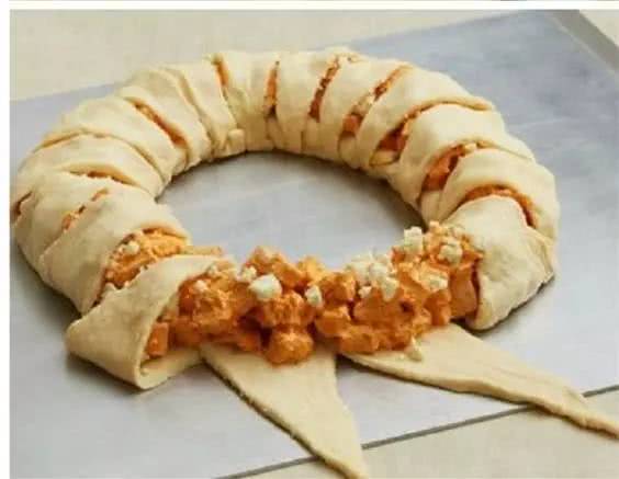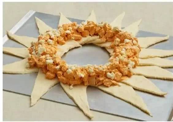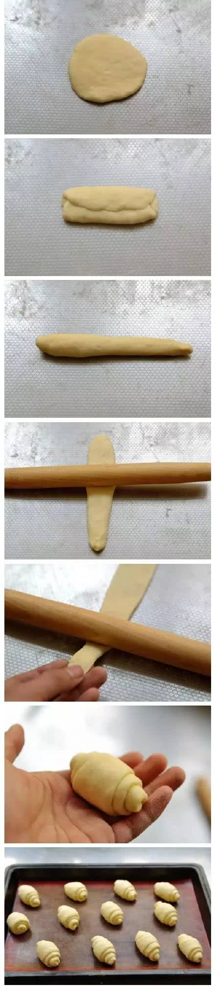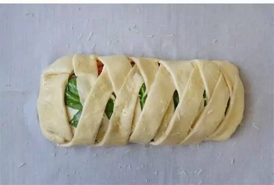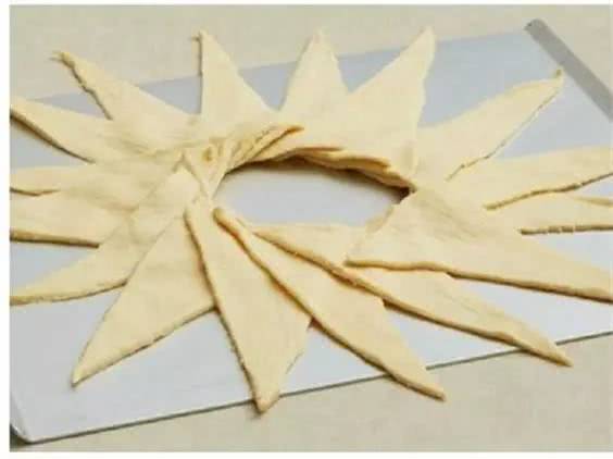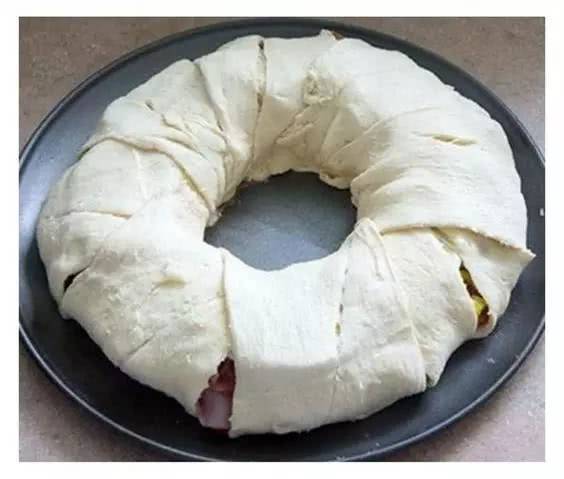 第三步:再依次如图将面皮由外向内的叠起来,末端和面皮底部衔接好,形成一个漂亮的圆环状,就可以拿去烤箱烤啦,等待你的可是一顿佳肴噢~