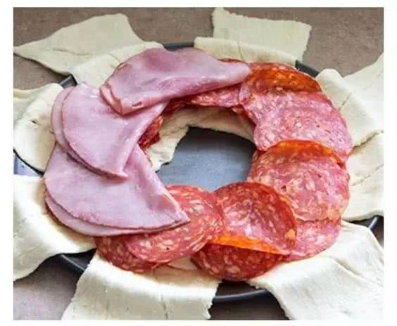 第一步:将面皮切割成矩形,如图平铺在烤箱盘上,依次盖上香肠和熏肉片,