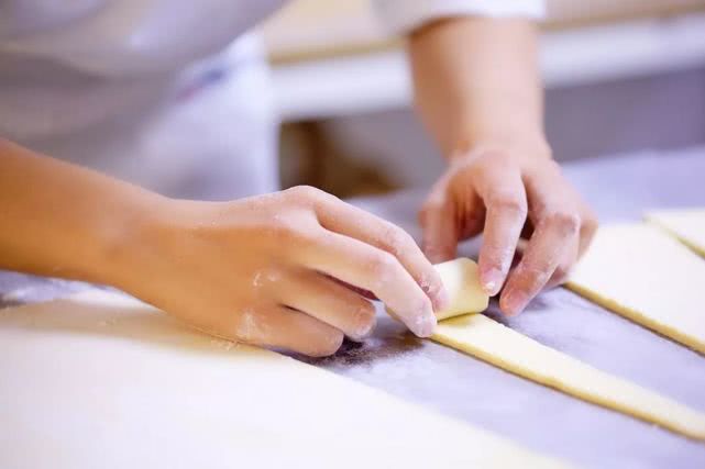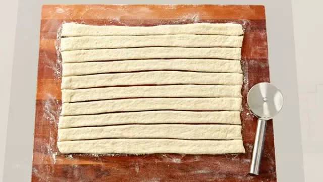 第一步:将面团擀平之后,如图割出一道一道的长条。