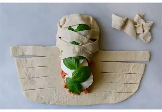 第二步:将两侧空出的面皮斜割,按照如图所示的形状分别依次交叠起来,最后刷上一层油。