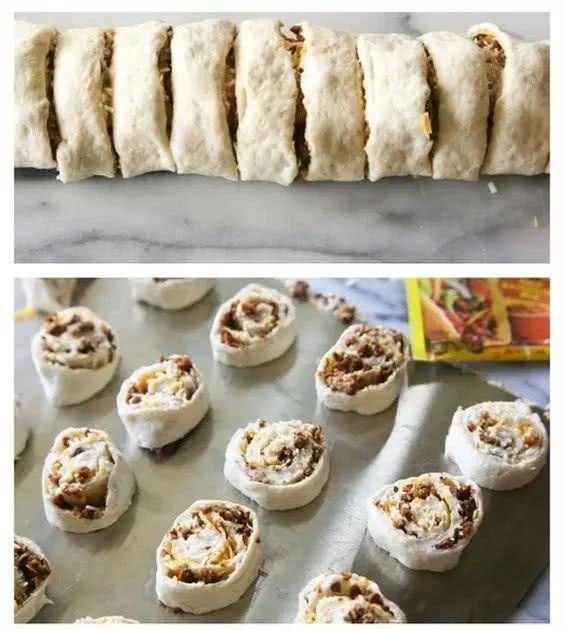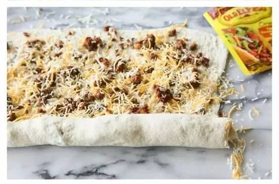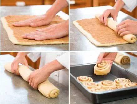 第一步:将面团擀平,铺上肉桂粉,撒上奶酪起司条,沿着面团皮的边缘卷起来,