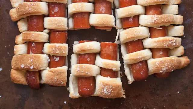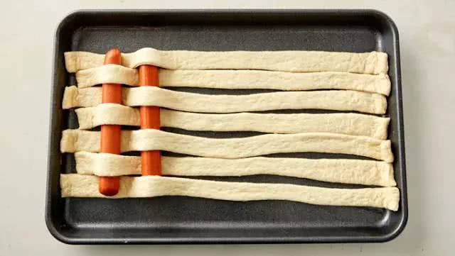 第二步:按照如图的方法在条状面皮之间依次塞入香肠,直到放完为止。