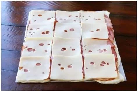第二步:在熏肉片上方盖上一层薄薄的奶酪片,