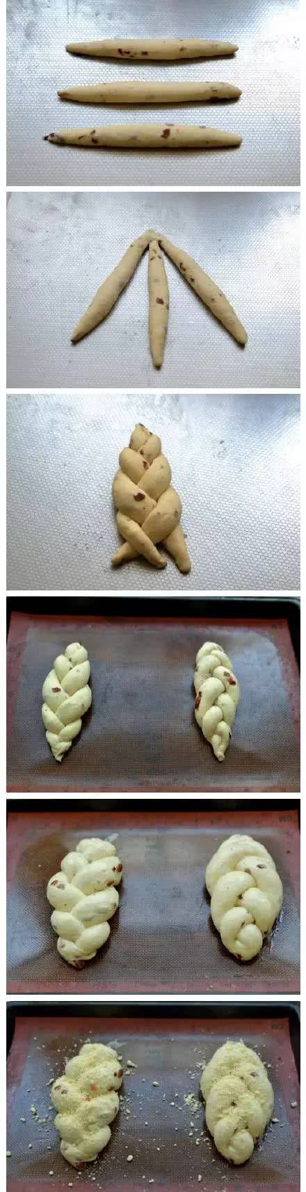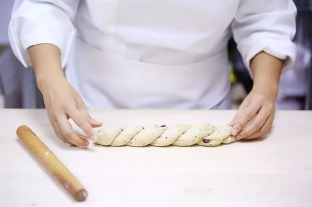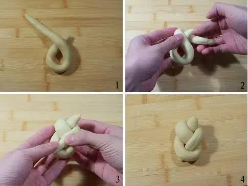 第二步:将每两个条状面团和中间的食材拧在一起,拧成若干个如图所示的形状,