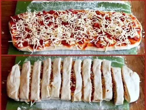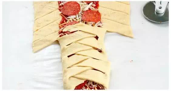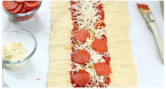 第一步:将发酵好的面团擀成长条状,铺上披萨酱和切成小片的火腿肠,再撒上一层芝士碎,再铺上一个面团,切成如图所示的形状,