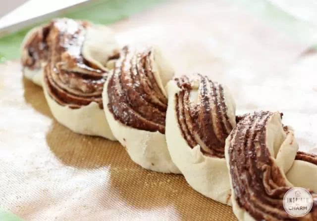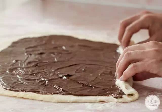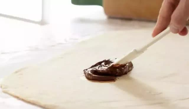 第一步:将发酵好的面团擀平铺开,均匀的涂抹上一层巧克力酱,喜欢吃巧克力的可以多涂一层~