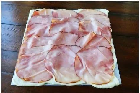 第一步:将面皮擀成一个正方形,铺上一层熏肉片,