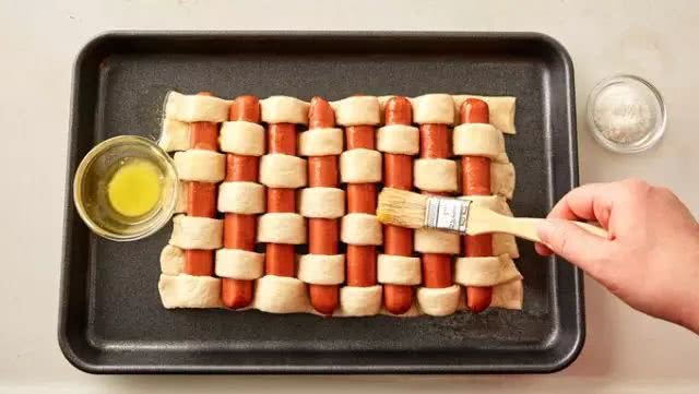 第三步:打一个鸡蛋,将蛋液均匀刷在香肠和面皮上,