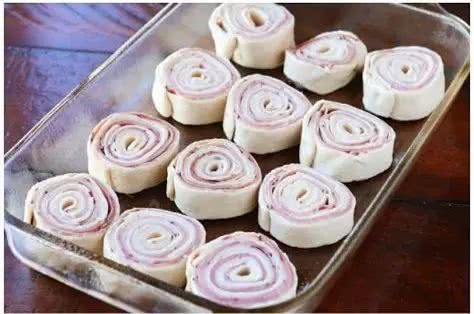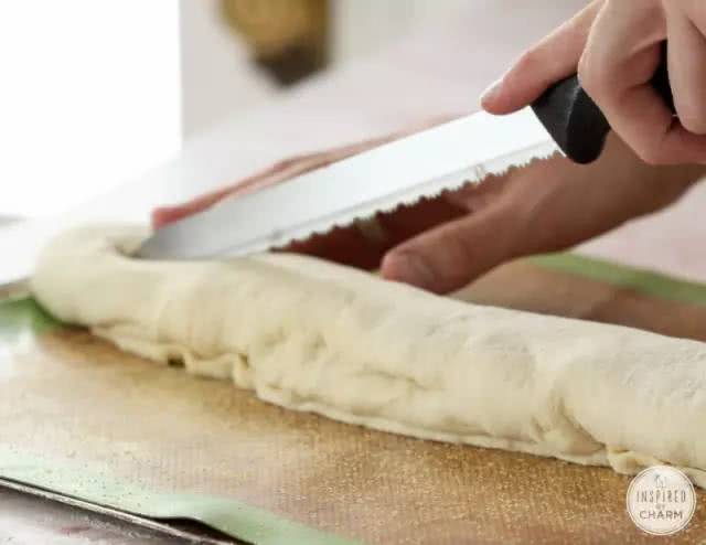 第三步:沿着边缘处卷起面皮,再像切寿司那样,切成一块一块的横截面,依次码入容器中,
