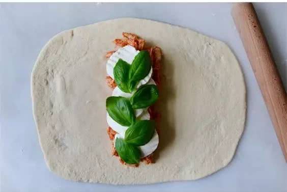 第一步:将面团擀平,中间放入涂了照烧酱的鸡肉,盖上芝士片和罗勒叶,