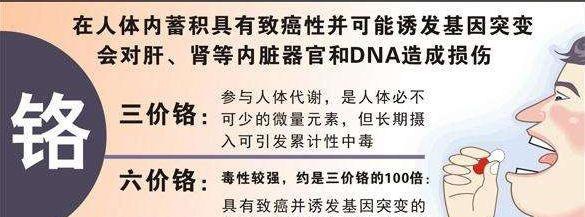 其中有毒的主要是六价铬,它是蛋白质和核酸的沉淀剂。在其还原为三价铬的过程中,可造成细胞损害。它在红细胞内,能抑制谷胱甘肽还原酶,使人体内出现高铁血红蛋白,可能有致癌作用。
