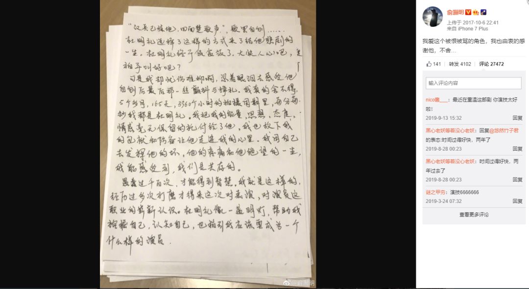 但俞灏明一直对这个角色心存感激,他认为这是他转型之路中关键的一步。杜明礼“下线”后,他在微博发文:“我爱这个被恨被骂的角色,我也由衷地感谢他,不舍……”