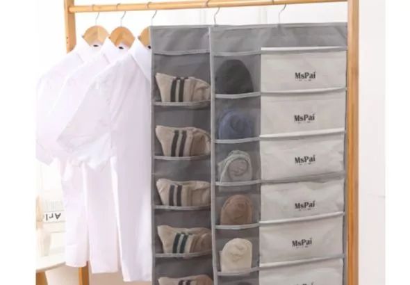 这款衣物收纳袋使用牛津布制作,适合储放贴身衣物。正反面都有袋子,不同大小的口袋可以存放不同的衣物,分类收纳井然有序。格子正面使用透明网格,方面寻找衣物的同时增加了透气性。