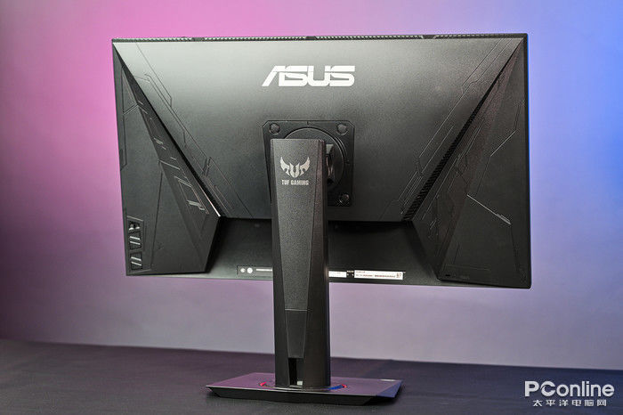 华硕 VG279QM背面,虽然没有RGB灯效,但是电竞风格依旧突出。支架两侧仿鹰翼的凹槽、纹理。