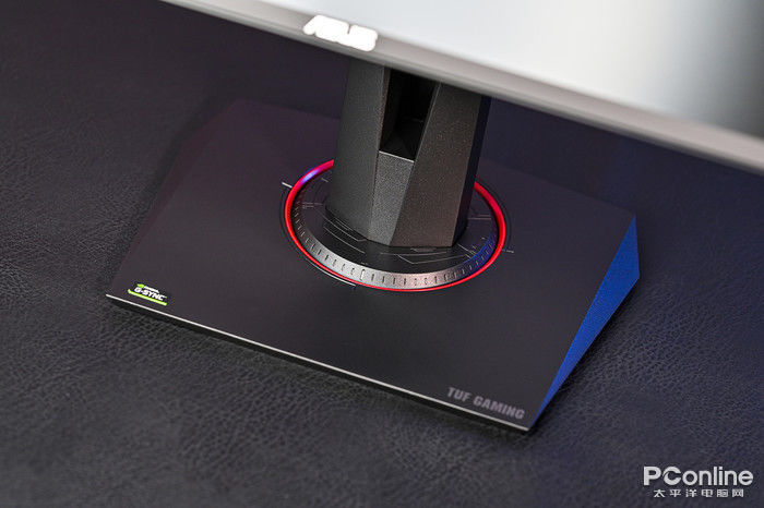 支架底座,环绕刻度盘的是亮红色环带,凸显电竞风格。底座上除了“TUF GAMING”的品牌LOGO,还多了G-SYNC的认证贴标 。