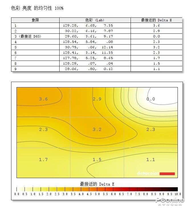 100%亮度下测试,色彩均匀性表现如图。右上角色温最接近6500K标准值,最大偏差值3.6出现在左上角,色彩均匀性表现不错。