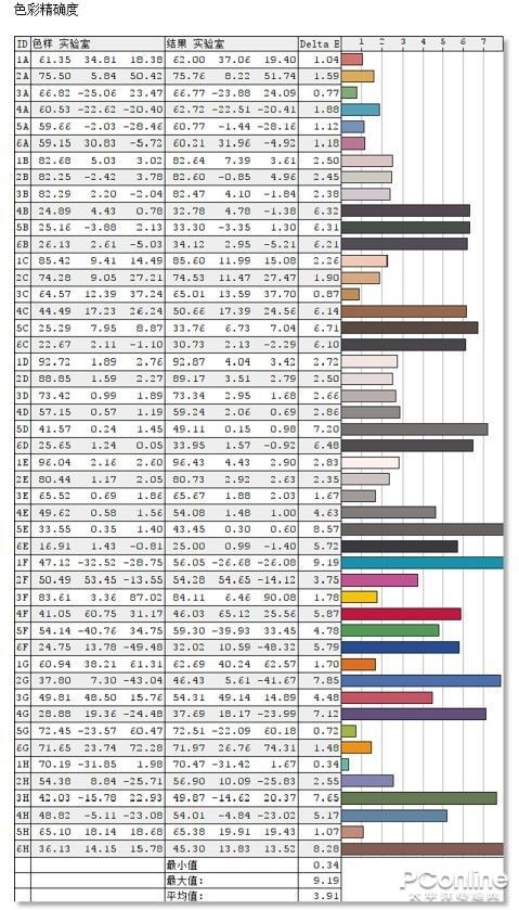 色准测试,结果显示48种颜色的平均△E值为3.91,其中最大偏离值为9.19,最小为0.34。对于一款小金刚定位3000元档的显示器,表现不尽如人意。不过就实际使用来说,主要亮点在于电竞显示器中IPS面板可以最高实现280Hz超过刷新率,针对的是游戏方面的画面优化,从这个角度来看显示画面还是可以接受的。