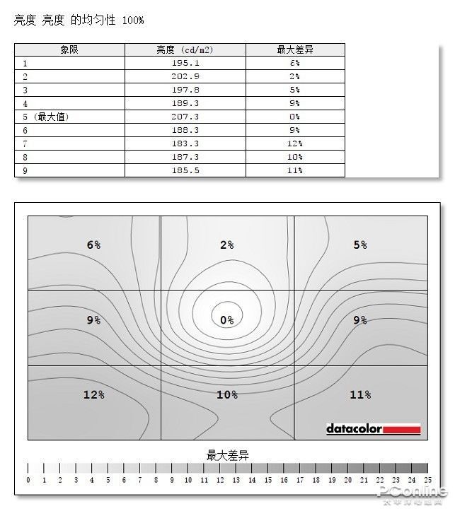 100%亮度下测试,亮度均匀性表现较好。最大亮度207.3cd/㎡,整体最大差异12%。亮度差异一般使用不容易察觉。