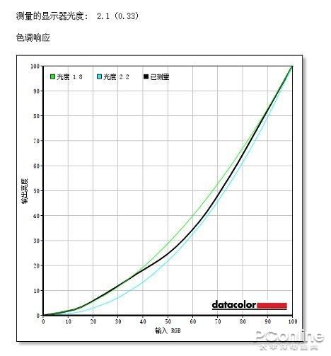 色调响应测试,结果如图,黑色的测试曲线在两个基准曲线范围内,有一定的偏离,综合表现还算不错。