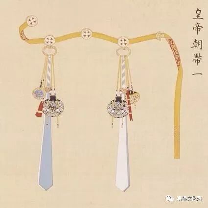 还有原本与袍服相配的 “ 刀、 削” 等各种带饰, 原本是马背生活中所随身携带的用具,在入关后虽失去了价值, 但却以礼制形式被规范保留与礼服相配,以求不忘民族之根本。