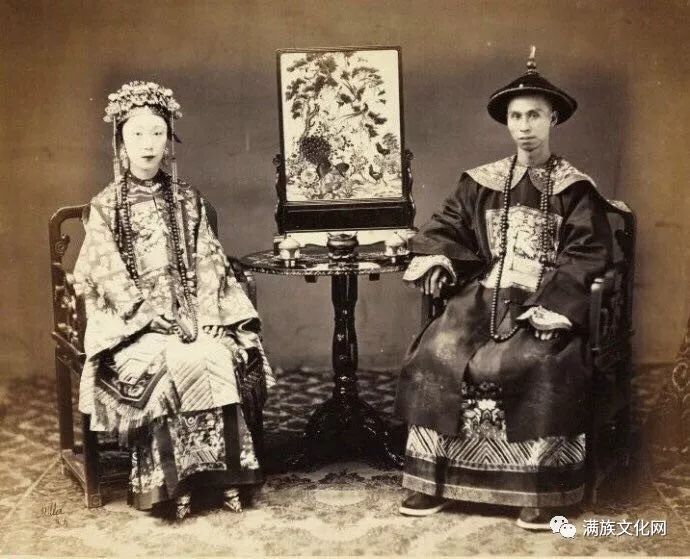 1867年广州清代官员夫妇像,其中官员内穿朝服,外穿补服。诰命夫人着凤冠霞帔。