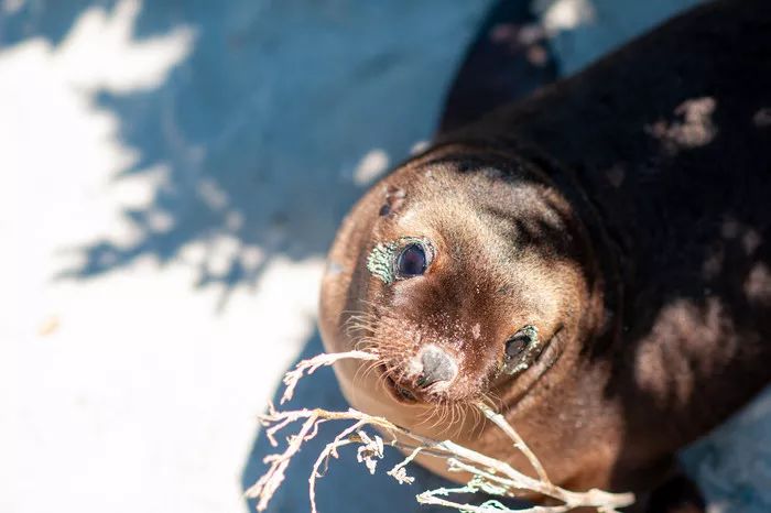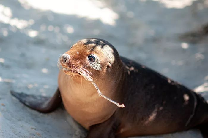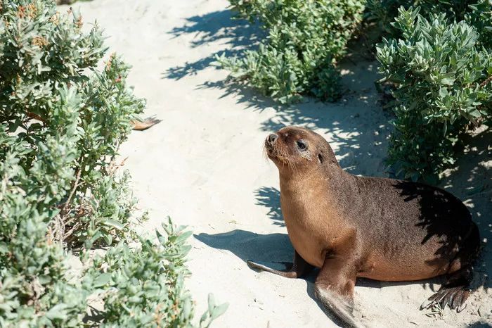 一只本来在睡觉的小海豹被我们的声音吵醒,就一晃一晃跑来了离我们很近的地方开始卖萌,一会睡到沙上,一会又咬起沙里埋的树支玩耍,特别可爱,海滩上还有一些大的不知道是海豹还是海狮的几只在打架,或者睡觉。