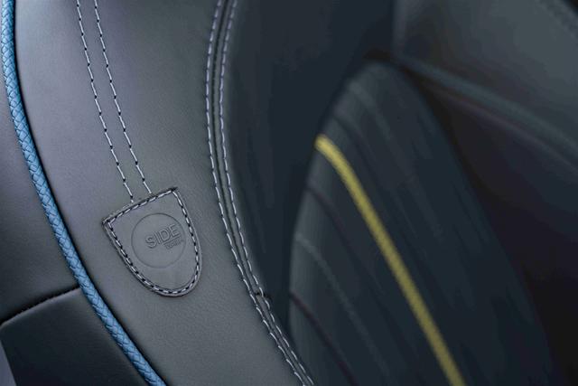 新MINI CABRIO Sidewalk限量版拥有独一无二的专属内饰设计,乘客侧的钢琴黑发光装饰条与青绿色和银色相间的设计相结合。车门内侧的椭圆装饰条同样是青绿色的设计,运动型真皮方向盘底部隐秘的“Sidewalk”标志和对比鲜明的缝线设计进一步凸显了该限量版车型的高贵英伦身份。