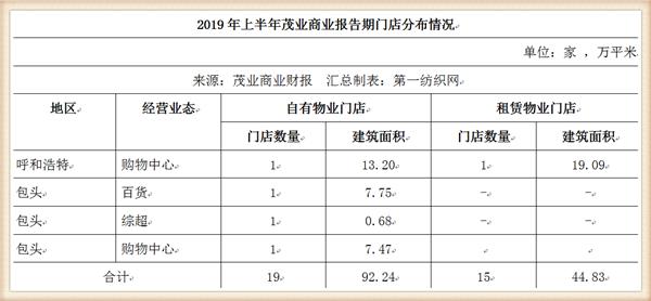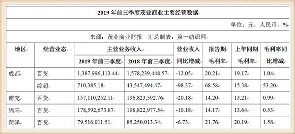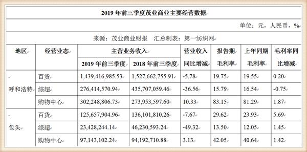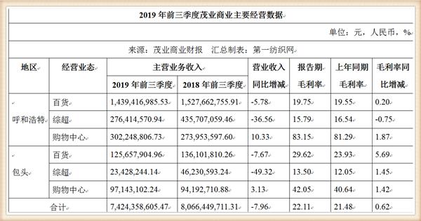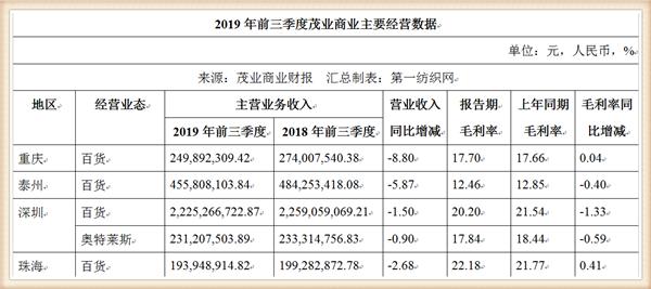 财报显示,截至2019年6月30日,茂业商业旗下实体门店数量总共34 家,经营业态包括百货商场、超市、购物中心、奥特莱斯;经营模式包括自营模式、联营模式和租赁模式,以联营模式为主。2019年前三季度,茂业商业实现营业收入86.6亿,同比下降4.5%;实现归母净利润8.7亿,同比增长13.5%。(第一纺织网 martin)