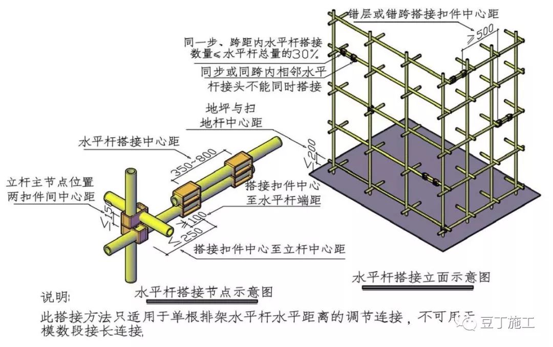 2.6立杆、水平杆的接长,以对接为主。 对接扣件与支架扣件的中心距不得大于支架的跨距或步距的1/3,且离最近的支架主接点扣件不得大于300mm。 其四周相邻的立杆的接头不应设置在同步内,同步内相邻立杆的接头在高度方向至少需错开500mm以上,且同一步、跨距内的搭接点不得大于杆件全数的30%。