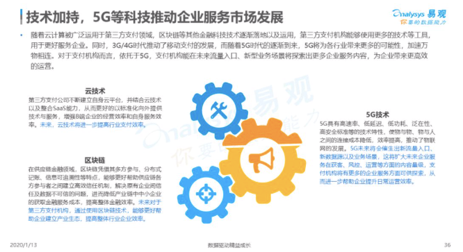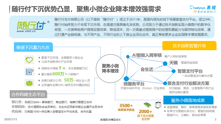 1月13日,易观发布《中国第三方支付企业服务市场数字化发展专题分析2019》,对当前支付机构在企业服务市场的广阔发展前景与机遇进行了深度分析,并介绍了诸如随行付等优秀企业的成功案例。