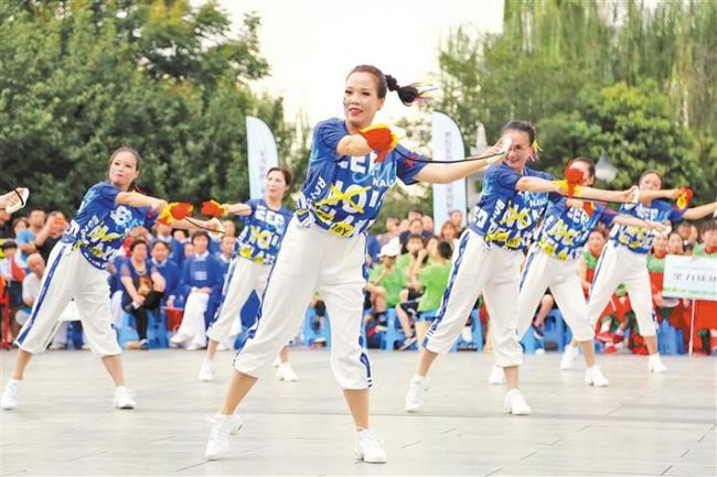 2019年陕西省全民健身运动广泛开展。图为西安群众进行广场舞表演交流。