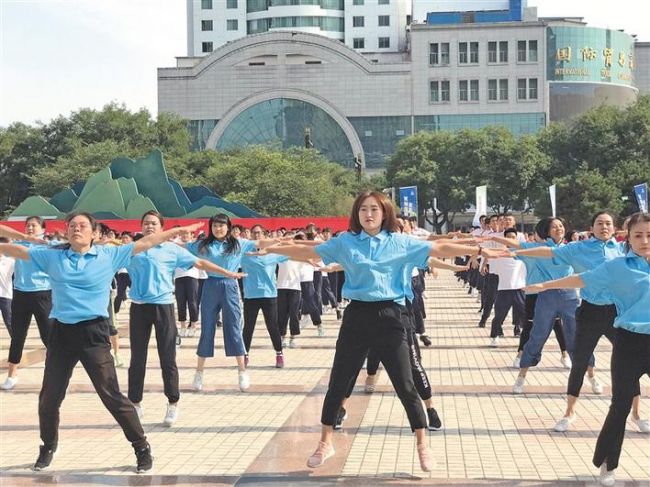 2019年,陕西省群众广泛开展广播体操运动。图为渭南市群众进行广播体操表演。