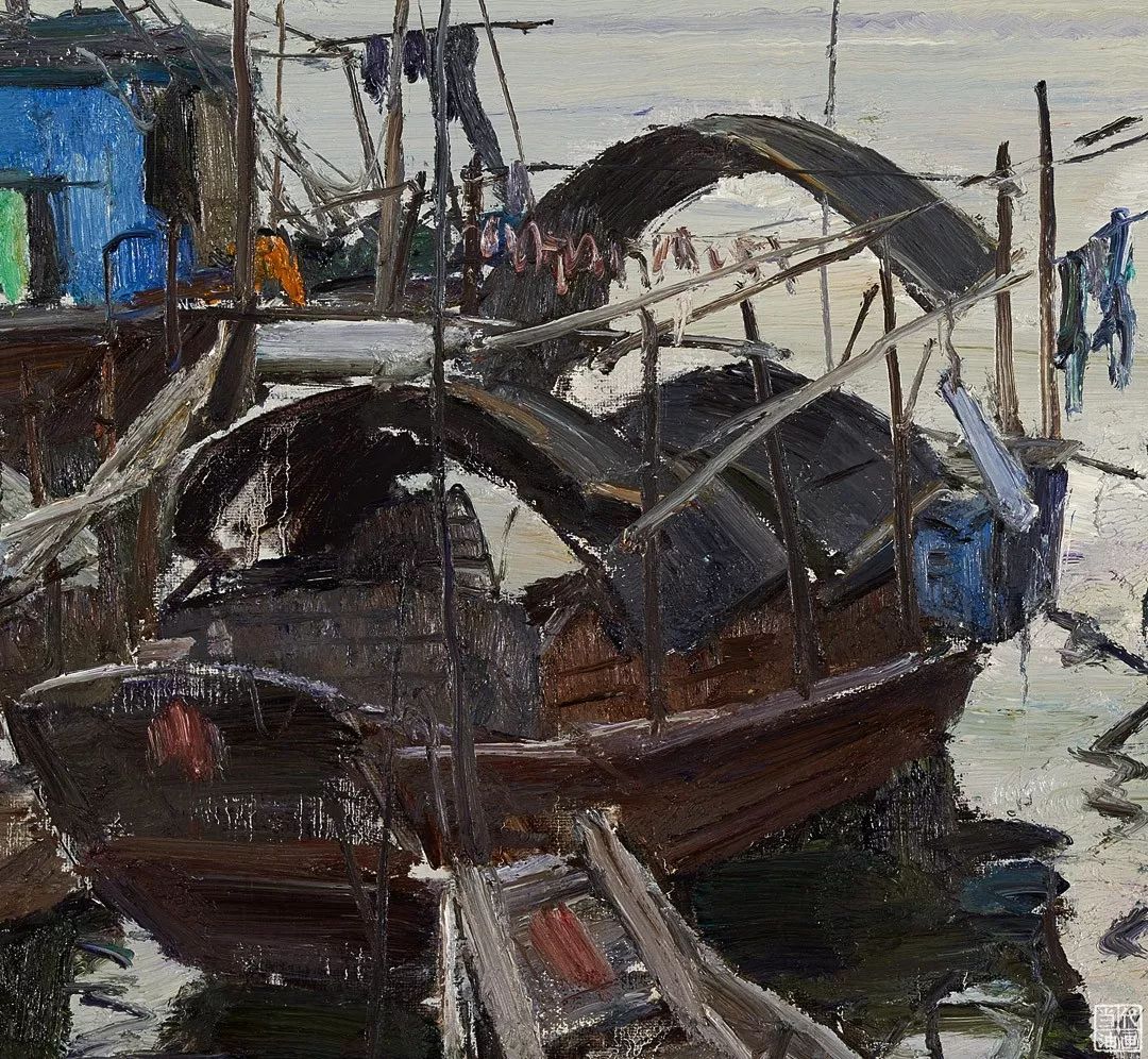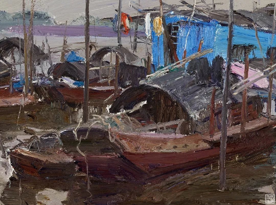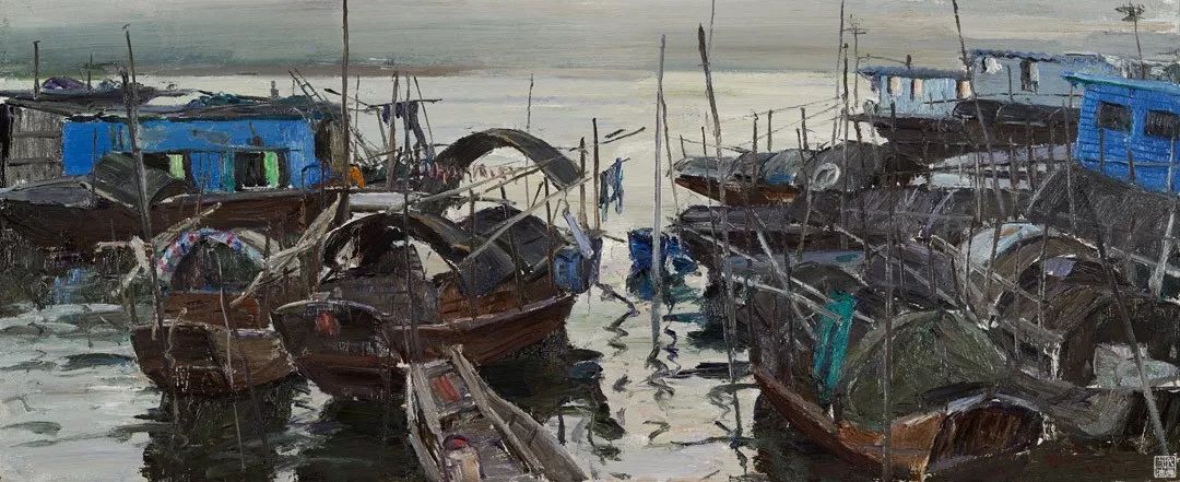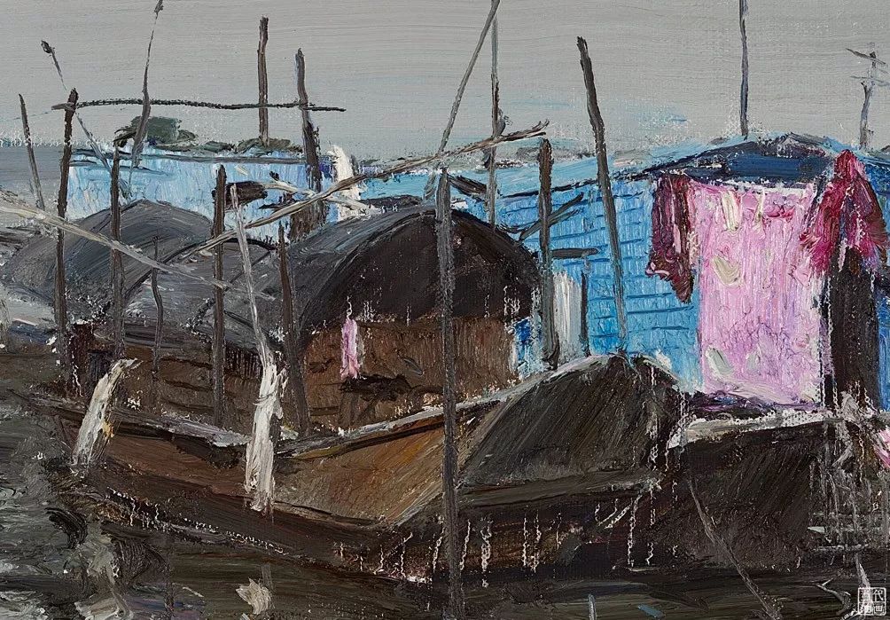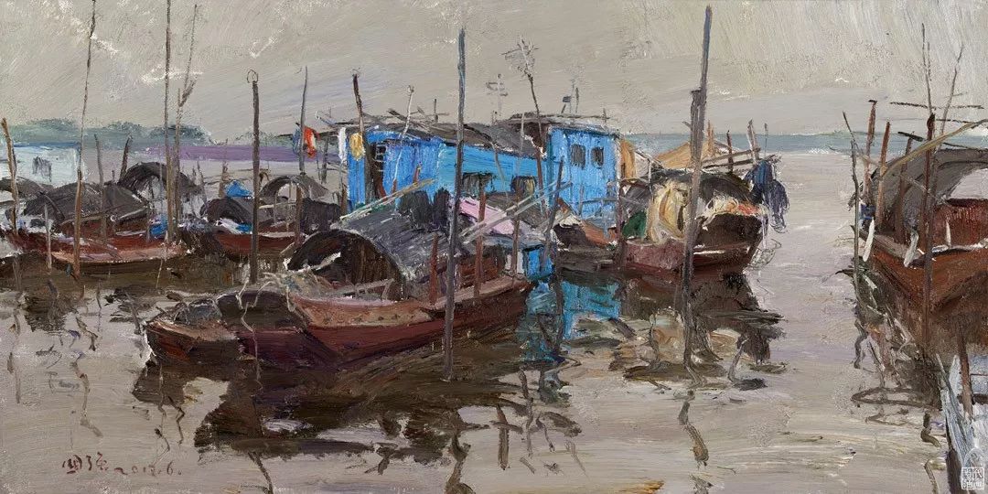 国强多年如一日画了许多大全景的黄土高坡,给我印象最深的是那些顺光的,几乎没什么阴影,干爽得很,大大方方,用笔很自然,坦然而沉醉,一点没有描描抠抠的毛病。 后来,又见他开始画印度的码头,画新的景致,舒展开新的视野、新的心境,比过去更开阔。