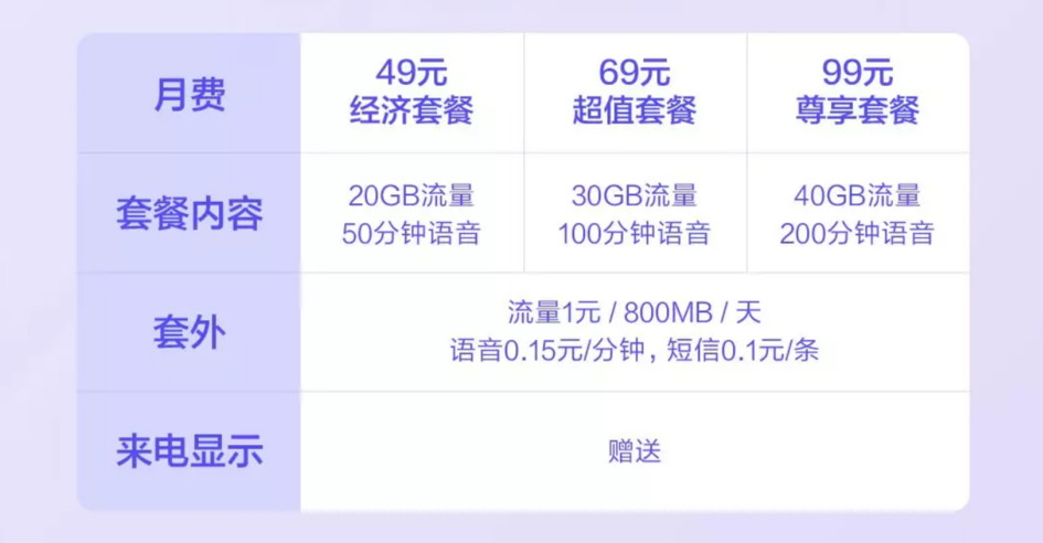 经济套餐:49 元/月,套餐内包含 20GB 流量、50 分钟语音