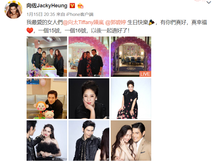 1月15日,向佐发博晒出为老妈向太陈岚和老婆郭碧婷一同庆生的照片,并配文:我最愛的女人們@向太Tiffany陳嵐 @郭碧婷 生日快樂,有你們真好,真幸福[心],一個15號,一個16號,以後一起過好了!