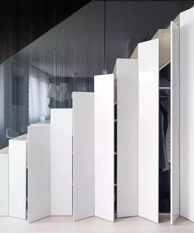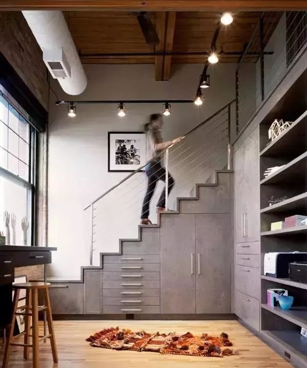 抽屉和储物柜连接,镂空的楼梯底部,也是一种很好的处理办法。