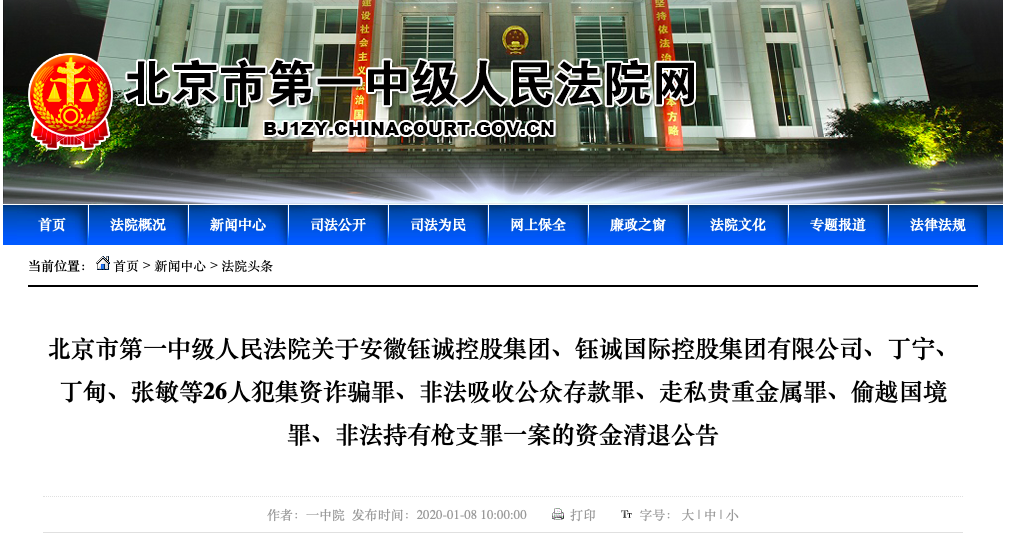1月8日,北京市第一中级人民法院布了《关于安徽钰诚控股集团、钰诚国际控股集团有限公司、丁宁、丁甸、张敏等26人犯集资诈骗罪、非法吸收公众存款罪、走私贵重金属罪、偷越国境罪、非法持有枪支罪一案的资金清退公告》。