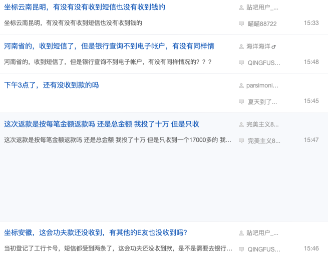 记者在e租宝的一个贴吧看到,目前全国多地的受害者都已经开始陆续收到退款,也还有不少人还在焦急等待中。