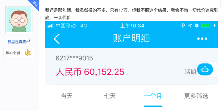 不过,也有受害人认为还远远不够,要继续追究下去。一位名叫“那里真是我”的网友展示了他收到的60152.25元的退款。还表示,投了17万元,并不满意这个结果,“我会不惜一切代价追究到底,一切代价。”
