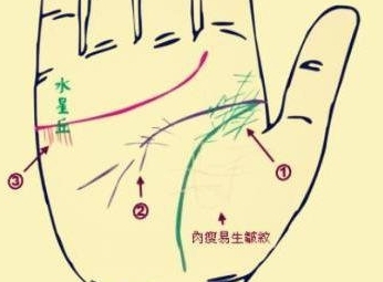 水星线又称作直觉线,出現于小拇指根处的水星丘,主管创作力、财商教育、商业判断能力,是后天三纹中最独特的一个,我们仔细观察那条线能够看得出一个人的直觉准不准,有木有商业天斌。有清晰水星线的人,一般 直觉都很精确;此外还意味着着財富,假如有清晰的水星线,加上有上升线,这个人的能力强,运势也不错。