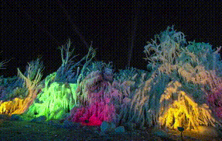 结合大自然的鬼斧神工-断崖,加上人工铺管喷水,形成了壮观的冰山、冰川奇观。
