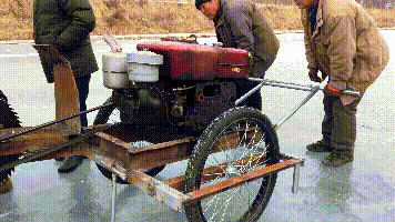 在飞转的电锯下,厚厚的坚冰像豆腐一样被切开,扬起的碎屑像雪花一样四处飞散。工人们把冰分割成一米见方的冰块,几个人合力用专用的挂钩将冰块拉出,再从光滑的冰面上推到冰灯区,进行雕刻。每一处造景,都是咱们本地劳动人民的智慧结晶。