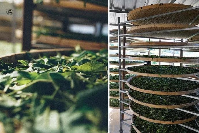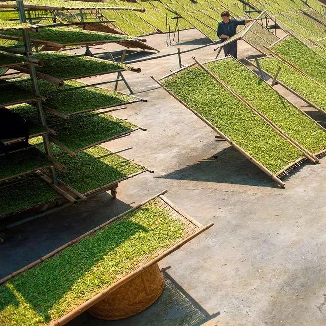 但自然萎凋的弊端在哪呢?不太适用于大产量订单,极其耗费人力场地,在摊晾过程中,平铺得均匀,不然重叠的部分会变黑,影响成品的外形及口感。选择的用具也很讲究,得用竹编制的有缝隙的篾箅,这样可以让茶的上下都能有空气流通。萎凋过程还必须根据天气情况,及时观察叶温变化,叶温提升到一定程度,需移至室内凉置,否则叶温过热,氧化速度太快,毛茶叶片叶梗芽蒂部分发红,茶汤粗涩偏老;叶温过低,叶体暗淡发黑,茶汤混沌且带有异味。