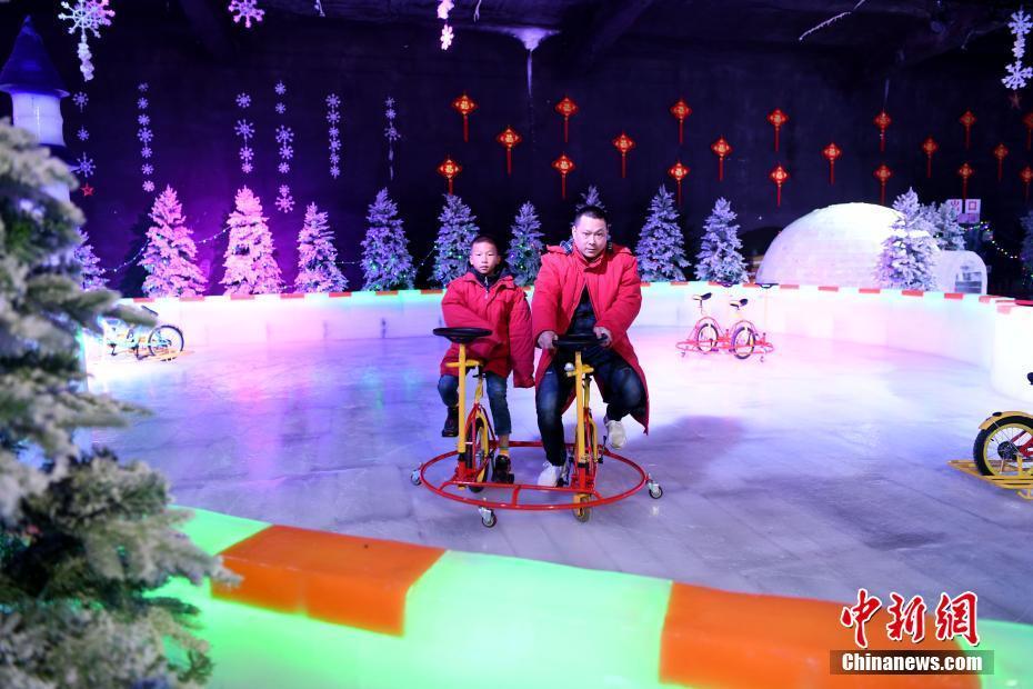 1月19日,游客在福建省尤溪县侠天下景区里的“冰雪江湖”体验北国风光。“冰雪江湖”恒温零下10度,是以侠文化体验、观赏、互动为主题打造的冰雪世界。中新社记者 王东明 摄
