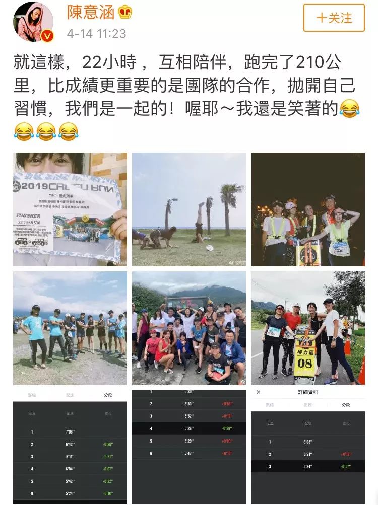 陈意涵在社交平台写道:“就这样,22小时,互相陪伴,跑完了210公里,更重要的是团队合作,抛开自己习惯,我们还是一起的!喔耶~我还是笑着的”。